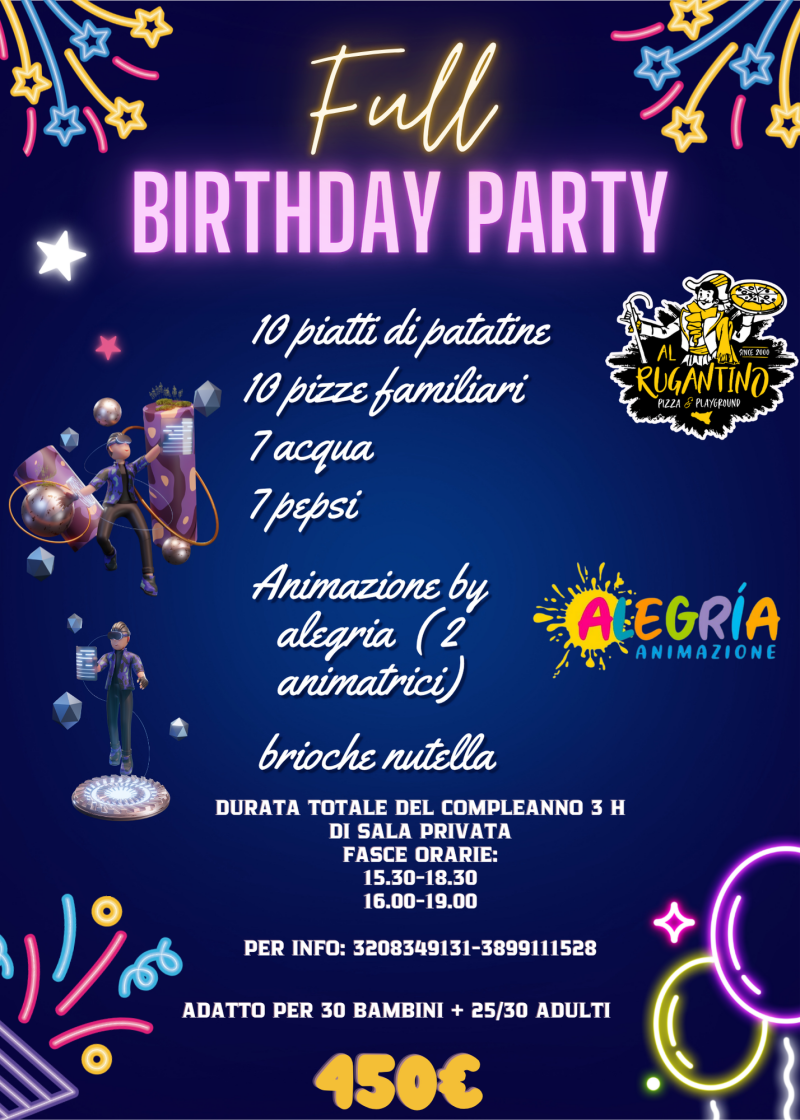 Non aspettare, prenota subito il compleanno pomeridiano del tuo bambino presso newrugantino! Il nostro team è pronto ad assisterti nella pianificazione di ogni dettaglio, garantendo un'esperienza indimenticabile per il festeggiato e i suoi amici.