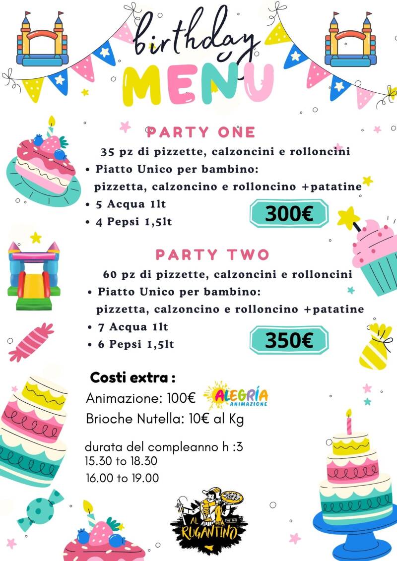 I nostri menu per compleanni pomeridiani includono opzioni appositamente progettate per i bambini, con pizze di vario gusto e patatine , seguiti da brioche con nutella !